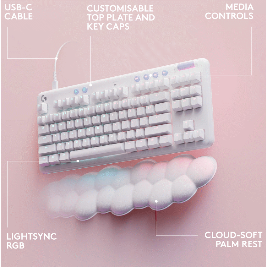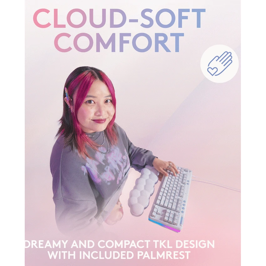 From the Aurora Collection, G713 is a wired, compact TKL keyboard designed for comfort with included cloud-soft palm rest. Fully equipped with ethereal RGB lighting and your choice of GX mechanical switches. Comes in White Mist. Colorway accessories sold separately. JUST YOUR TYPE G713 Gaming Keyboard from the Aurora Collection is a wired USB compact mechanical keyboard that delivers low-key vibes with high-key performance. Express yourself and play your way. LIGHTSYNC RGB Per-Key and Perimeter lighting Cozy and Compact Included palm rest + TKL design SKY-HIGH COMFORT, LOW-KEY FOOTPRINT G713 will support you in play. That’s why our cloud-like palm rest is included to complete the dreamy desktop vibes. Save the day and your desktop with a compact, tenkeyless footprint. Your mousepad will thank you. And make sure your fingers are relaxed and ready to explore with adjustable height feet. All-day play? Yes, please. STYLED BY LIGHTSYNC LIGHTSYNC brings your gaming to life with soft, ethereal halo perimeter and under-key lighting. Shine bright with four preloaded immersive Play Mood animations, the signature lighting for the Aurora Collection. Or customize your own lighting look and animation effects with ~16.8M programmable RGB colors using the free G HUB software. PLUG IN, PLAY ON G713 is always ready to play, simple and worry-free, with wired USB connectivity. Included USB-C to USB-A cable detaches for easy cleaning and travel. Enjoy a super-fast and always-on keyboard experience. GAMING-GRADE TECH AT YOUR FINGERTIPS Let the (good) games begin with the satisfying feel of mechanical GX switches and full media controls at your fingertips. Everything you need to play your best and take quick control of your music, movies, and more. Roll to the perfect volume in a flash. Your content at your convenience. And be sure to choose the right GX switch for you. Linear is quiet and low-friction. Tactile gives you feedback you can feel and some click. Clicky is the classic gamers’ fave with the most feedback. DIAL IN YOUR GEAR WITH G HUB Your keyboard is your navigator and G HUB gives you total control of your playstyle and your aesthetic. LIGHTSYNC RGB comes preloaded with Play Moods and has a selection of fun effects and animations. Game Mode is a lifesaver, too, where you can turn off certain keys while you game so you don’t interrupt any epic adventures. And there’s a lot more to customize and program, so go as deep as you want or just start playing right away. G715 is ready to go. Specifications 87 key TKL Tenkeyless to save space Double-Shot PBT Durable, textured key caps Media Controls With volume roller What’s in the box Logitech G713 Gaming Keyboard USB-C to USB-A cable – 1.8M Palm rest User documentation Technical Specifications 87 key tenkeyless (TKL) keyboard Individually-lighted RGB mechanical switches Double-shot PBT keycaps Under-case 16 LED perimeter lighting Media controls including Volume roller Brightness control Detachable cable System Requirements USB port Windows 10 or later macOS 10.15 or later iPadOS 13.4 or later iOS 14 or later